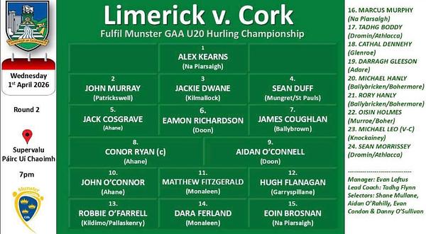 The very best of luck to Eamon and Aidan and the Limerick under 20 team as they line out against Cork in Cork tomorrow evening https://www.facebook.com/share/1BW3KcTE2H/?mibextid=wwXIfr